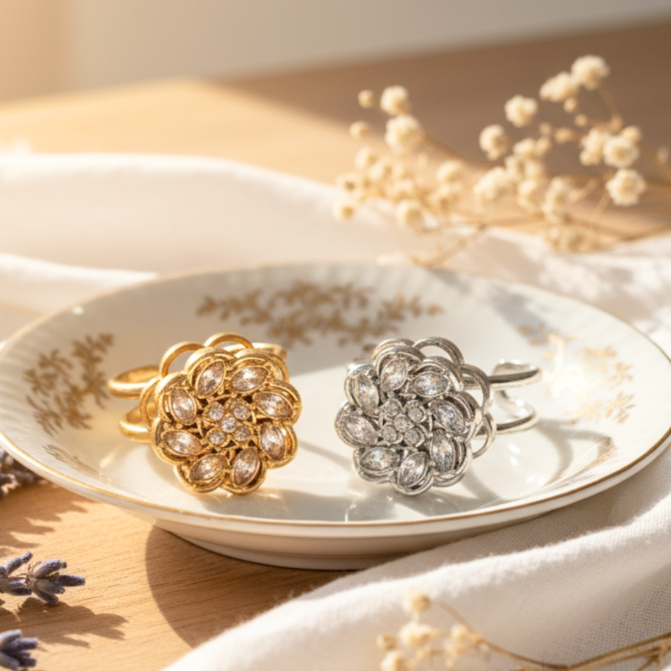 Bague anti stress rotative fleur ajustable en acier inoxydable – Doré ou argenté