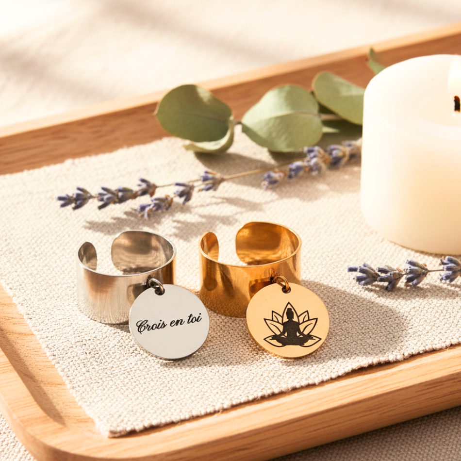 Bague mantra acier inoxydable – Lotus & “Crois en toi” gravés – Bijou spirituel recto verso – Ajustable, doré ou argenté