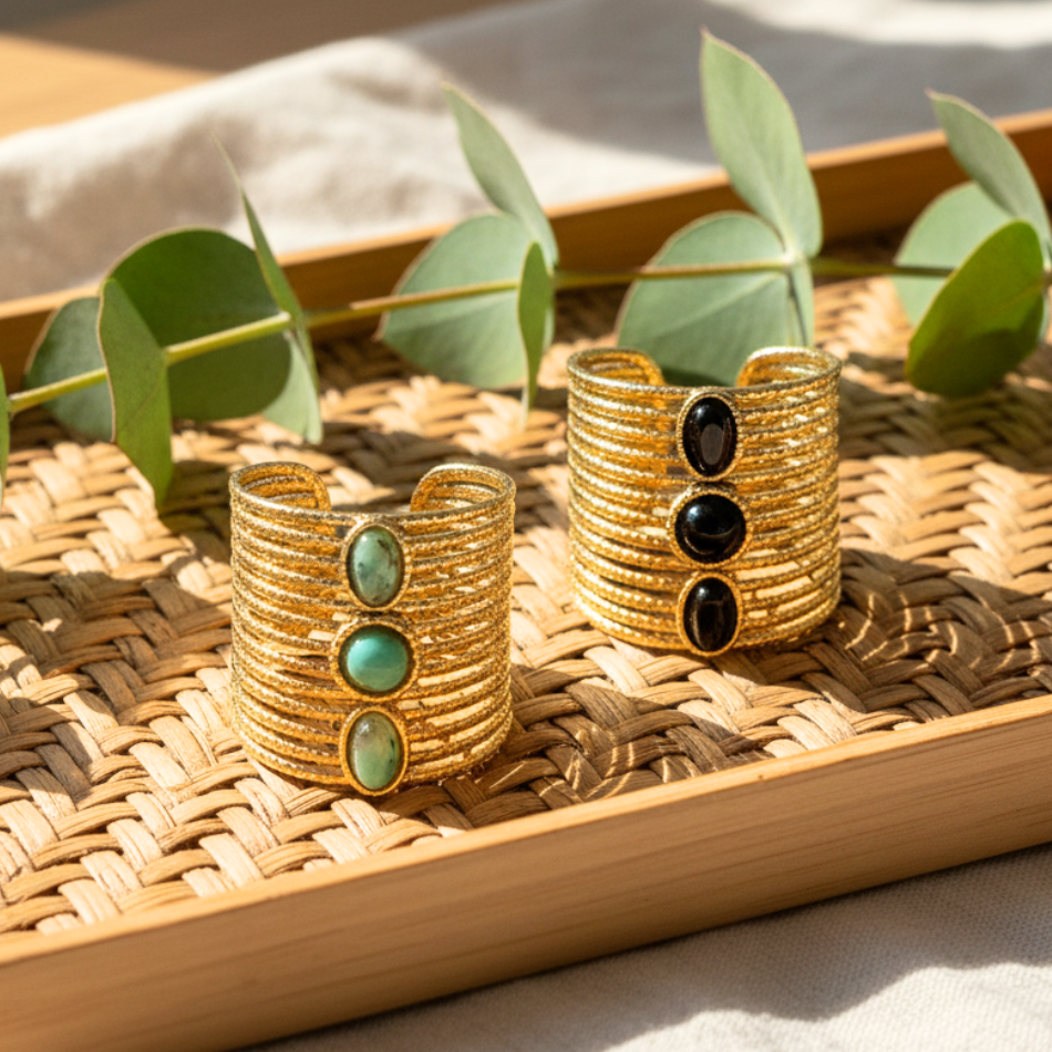 Bague dorée femme multirangs,acier inoxydable avec pierres naturelles