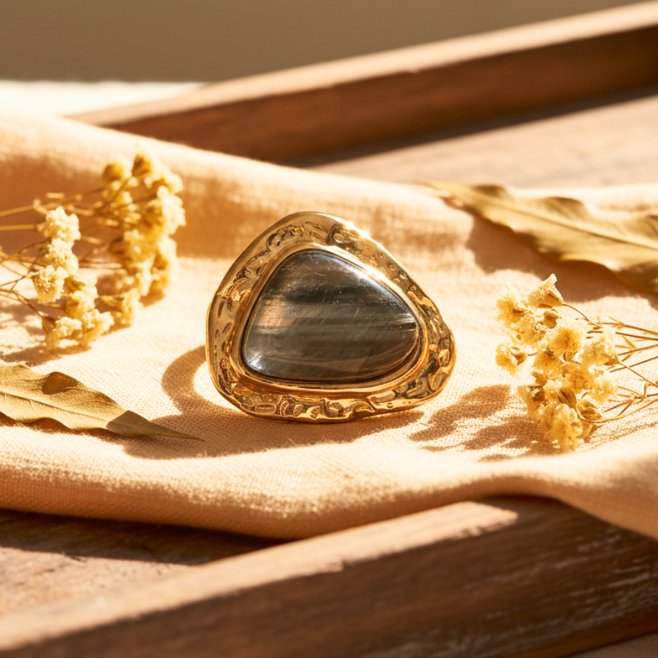 Bague dorée femme martelée Labradorite, acier inoxydable ajustable