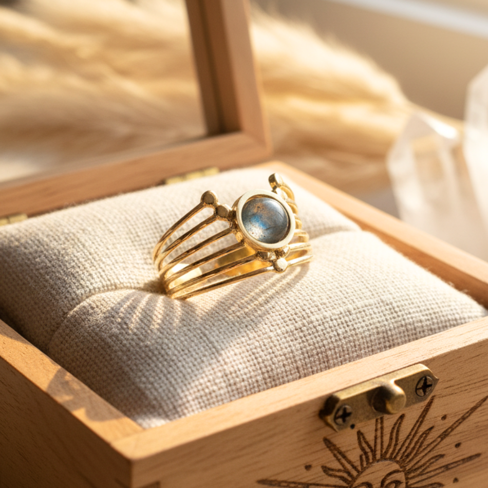 Bague dorée femme multi-rangs, Pierre labradorite, acier inoxydable ajustable