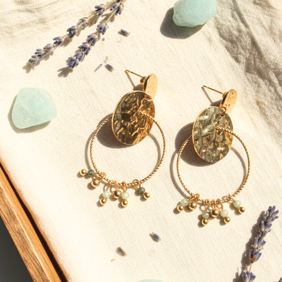 Boucles d’oreilles dorées martelées avec pampilles – Acier inoxydable et pierres naturelles vertes
