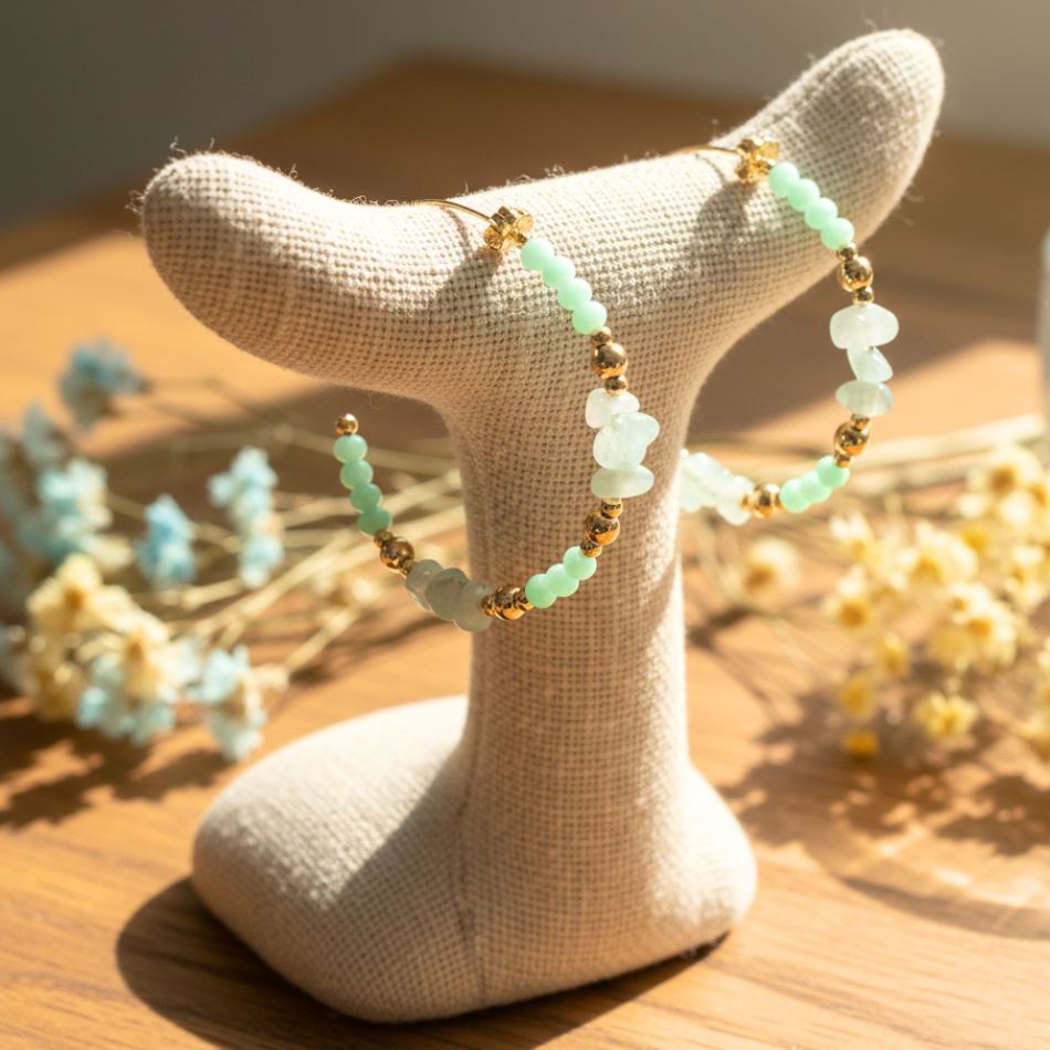 Boucles d’oreilles créoles vert d’eau et doré – Perles aventurine naturelle et acier inoxydable