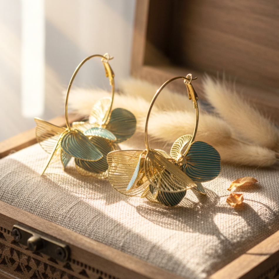Boucles d’oreilles dorées femme – créoles fleurs ajourées vert et or en acier inoxydable