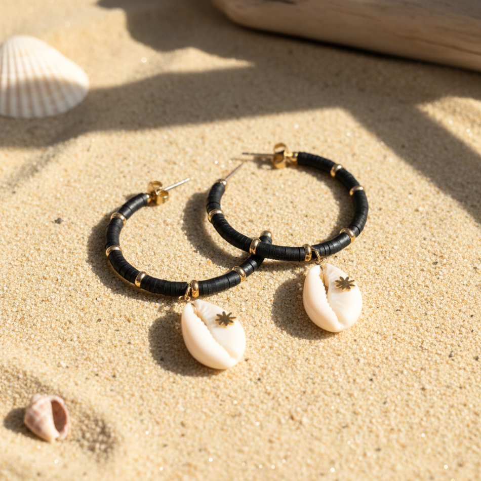 Boucles d'oreilles créoles coquillage cauri – Bijoux plage femme noir et doré – Acier inoxydable résistant à l’eau