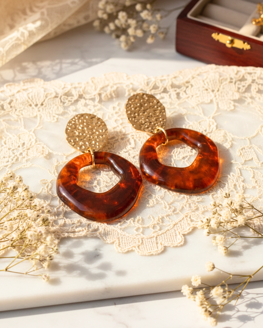 Boucles d’oreilles dorées et résine ambrée – Bijou femme tendance et élégant