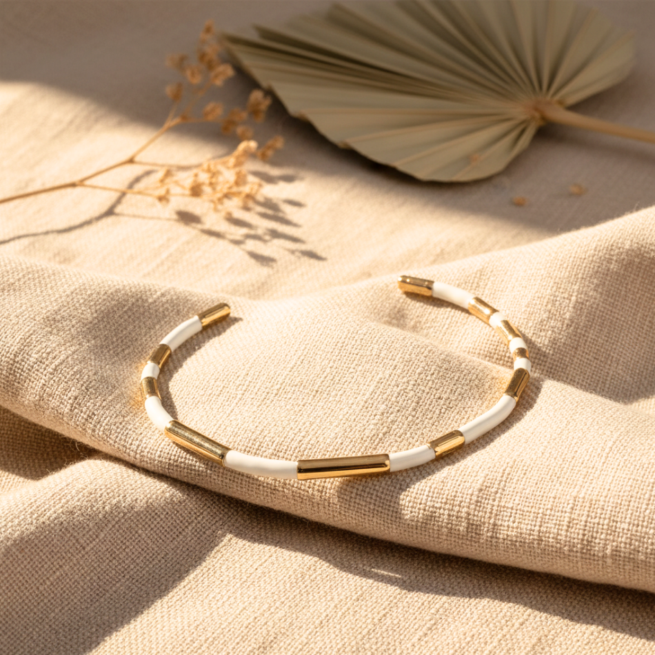 Bracelet jonc nacre blanche - Bijoux ouvert acier inoxydable doré