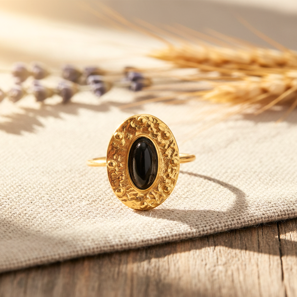 Design raffiné : anneau fin avec plateau martelé doré mettant en valeur la pierre noire ovale