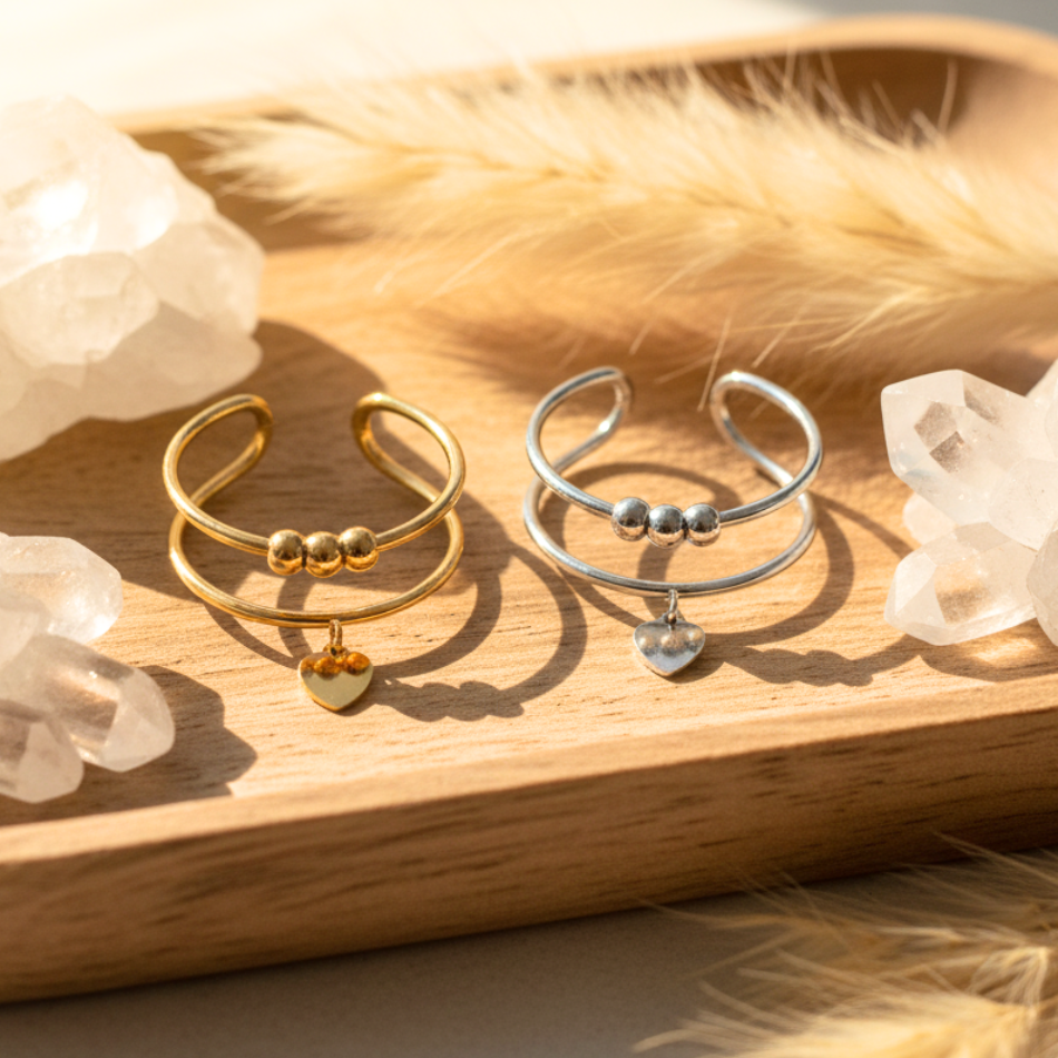 Ajoutez une touche d’élégance minimaliste à vos doigts avec cette bague double en acier inoxydable. Son design raffiné associe deux anneaux fins : l’un orné de trois perles lisses, l’autre d’un petit pendentif cœur, pour un bijou à la fois moderne, romantique et lumineux. Disponible en finition dorée ou argentée, elle sublimera toutes vos tenues et s’adapte à toutes les envies.