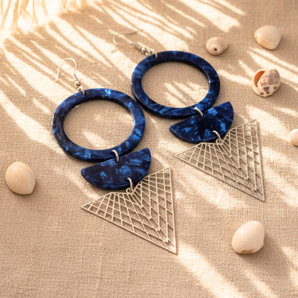 Boucles d’oreilles géométriques bleu nuit et argentées en acétate et acier inoxydable – Style bohème chic