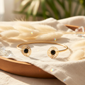 Les pierres noires, placées à chaque extrémité du jonc, apportent un contraste élégant et une touche mystérieuse, tandis que les médaillons ajourés laissent passer la lumière pour un effet lumineux et délicat.