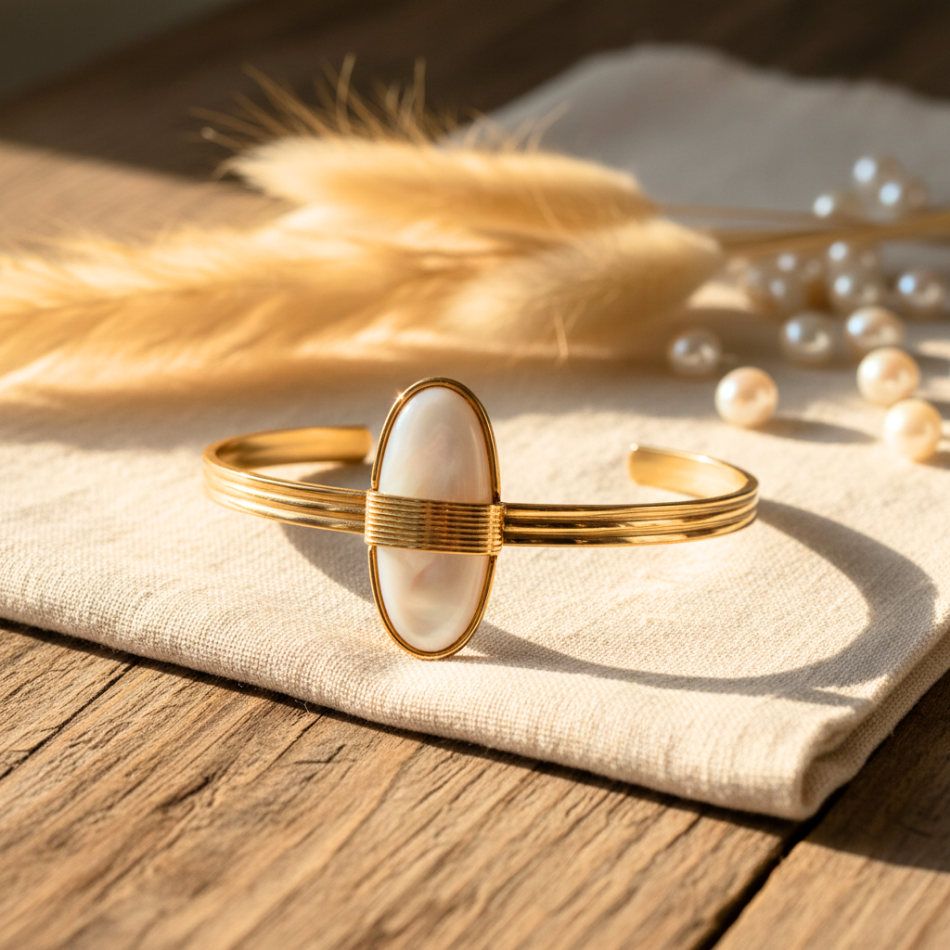 Laissez la nacre naturelle illuminer votre poignet grâce à ce bracelet jonc doré en acier inoxydable. Raffiné, intemporel et lumineux, il associe un cabochon ovale en nacre à une structure fine et texturée, pour un contraste harmonieux entre modernité et douceur.
