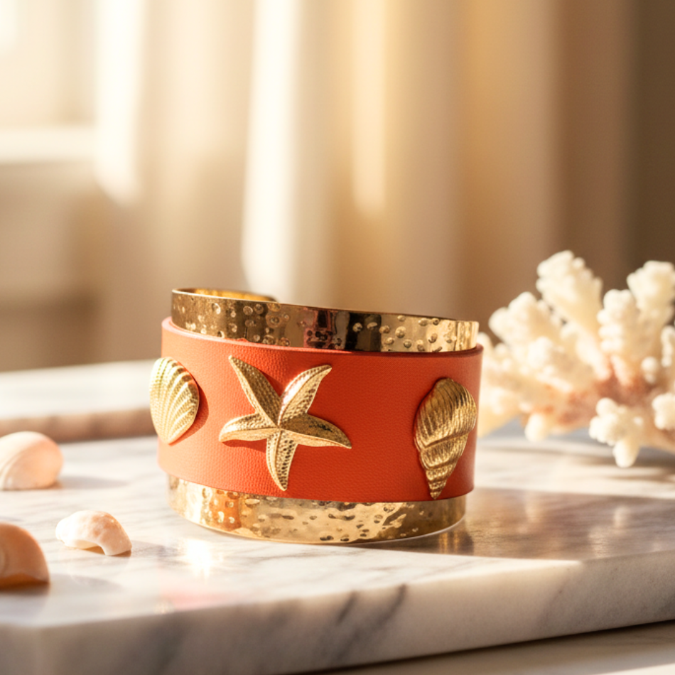 Cette manchette femme associe métal doré martelé et revêtement façon cuir coloré pour un contraste élégant et tendance. Disponible en blanc nacré, terracotta brûlé et camel sable, elle apporte une touche marine sophistiquée et lumineuse. Sa structure ouverte et souple garantit un confort optimal et s’adapte à la majorité des poignets.