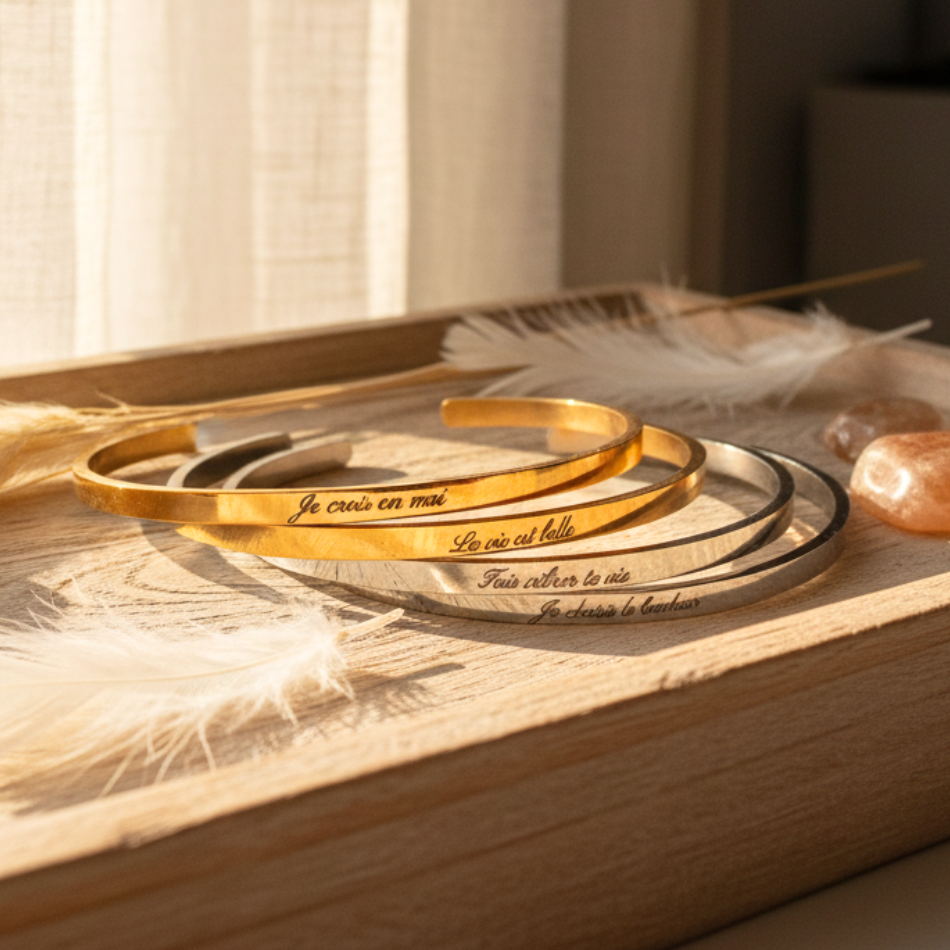 Bracelet mantra gravé femme – Manchette fine en acier inoxydable doré ou argenté