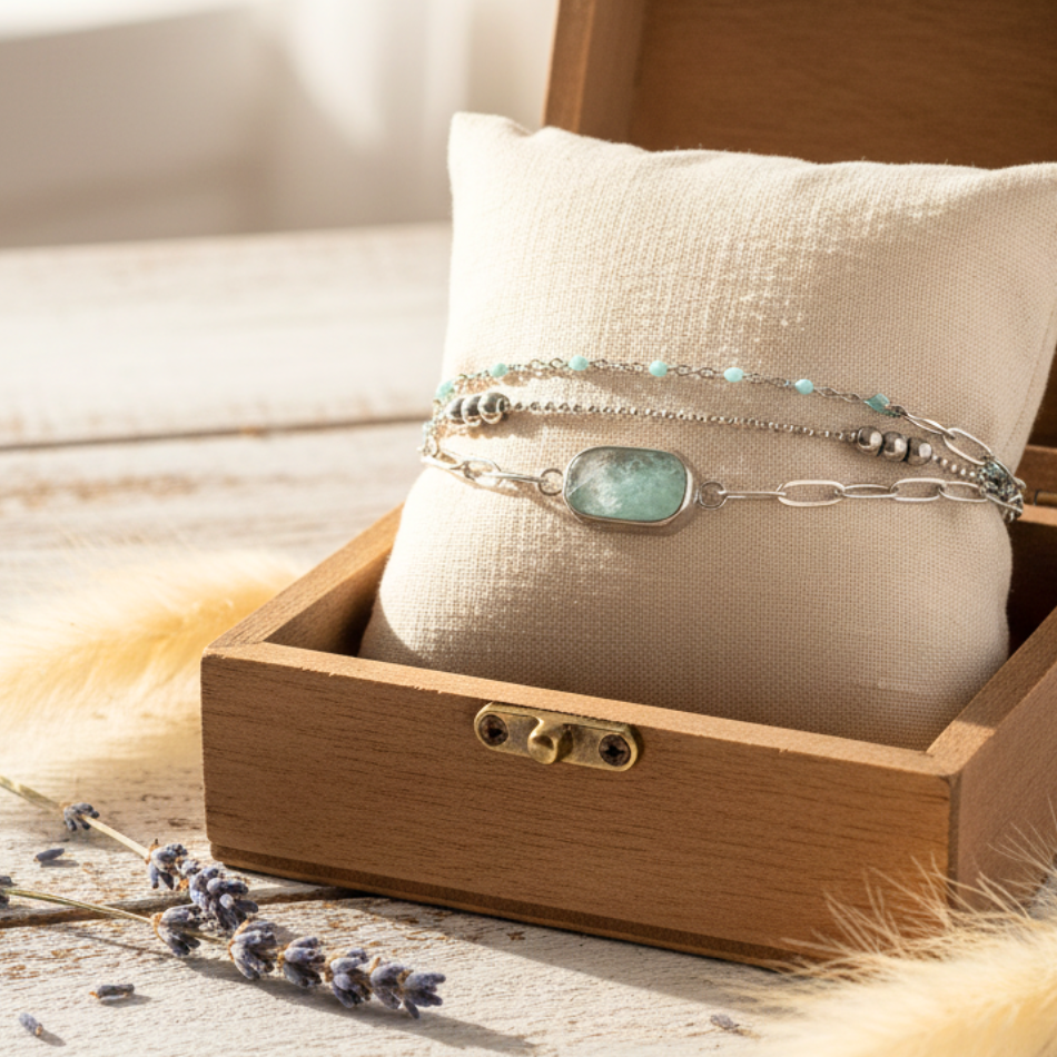Plongez dans la douceur des teintes bleu-vert avec ce bracelet triple rang en acier inoxydable orné d’une amazonite facettée. Raffiné et féminin, il séduit par son style bohème chic, parfait pour toutes celles qui recherchent des bijoux fins et colorés. Avec ses trois chaînes différentes subtilement assemblées, il offre un rendu tendance et équilibré sans effort.