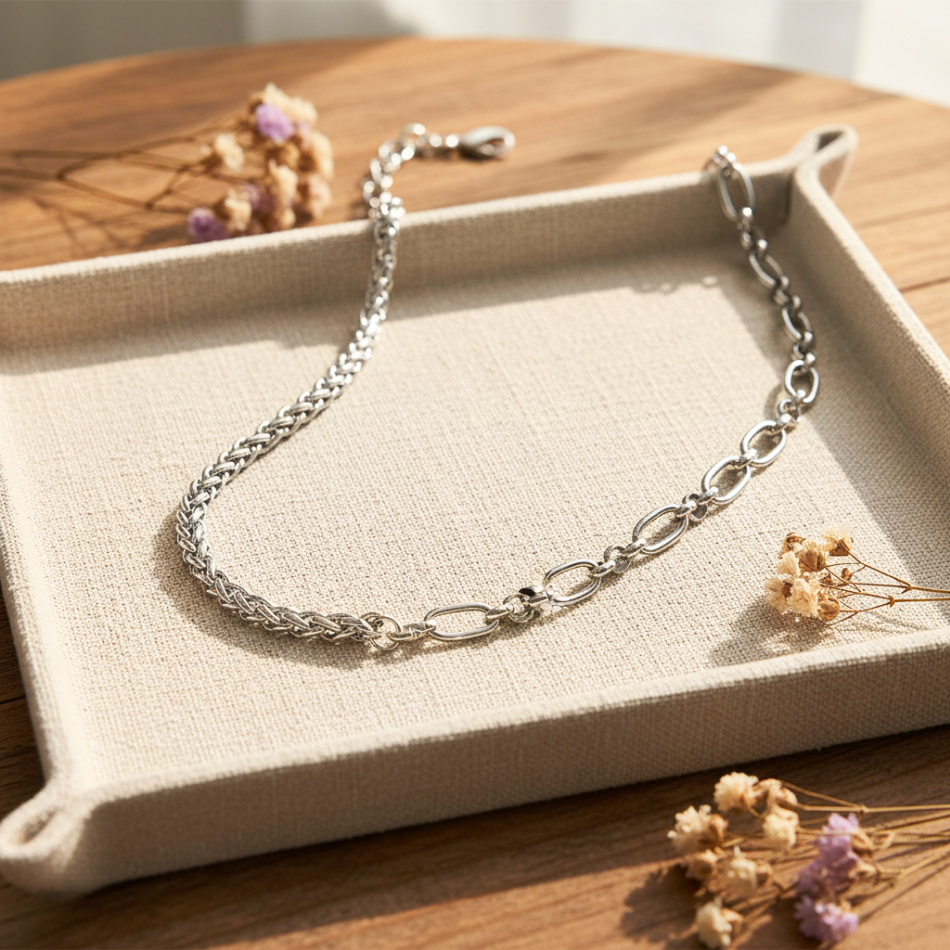 Ajoutez une touche de caractère à vos looks avec ce collier en acier inoxydable argenté, à la fois stylé et résistant. Son design unique mêle maillons ovales ouverts et chaîne tressée, pour un rendu contemporain qui se porte aussi bien au quotidien qu’en soirée. Conçu pour les femmes qui souhaitent affirmer leur style, il incarne l’équilibre parfait entre élégance et durabilité.