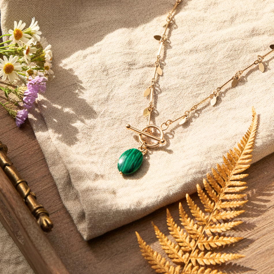 Collier doré en acier inoxydable avec pendentif vert ou bleu – Chaîne à pampilles et fermoir toggle