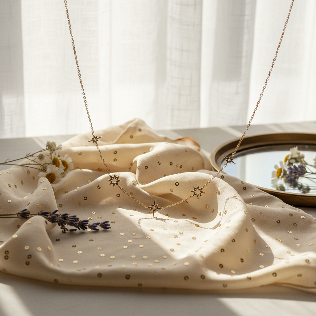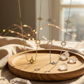 Faites ressortir votre élégance avec ce collier étoile du nord pour femme en acier inoxydable. Minimaliste, élégant et symbolique, il est disponible en deux finitions intemporelles : doré lumineux ou argenté éclatant. Les étoiles ajourées à huit branches rappellent la boussole céleste et les nuits étoilées, pour un rendu à la fois chic et spirituel.
