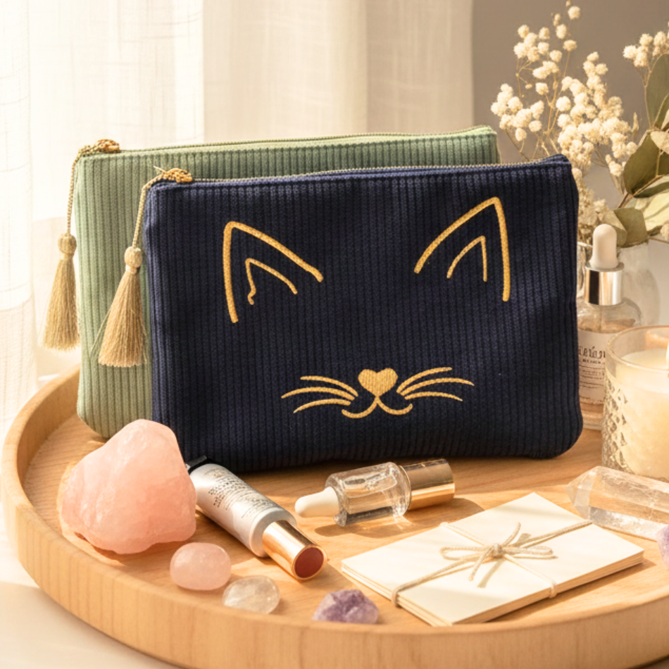 Pochette chat en velours côtelé avec pompon – Trousse zippée en tissu doublé, motif brodé doré